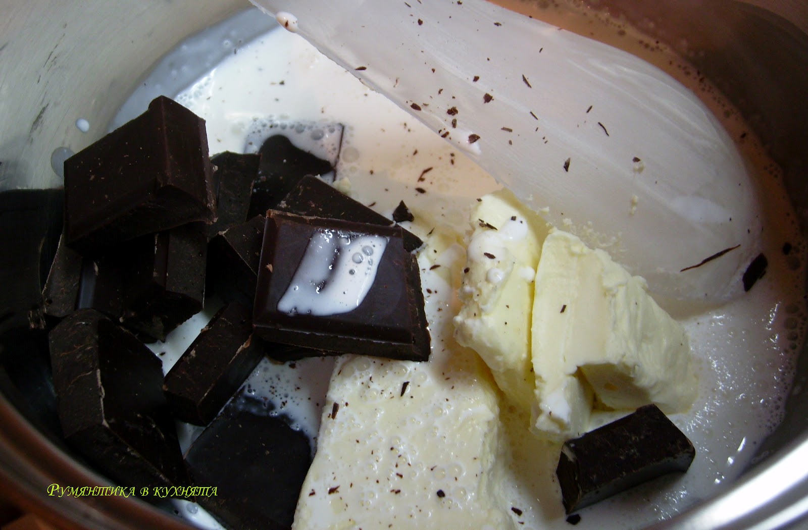 - В тенджера сложете заедно шоколада, маслото, вареното кондензирано мляко и сметаната. Загрейте с постоянно бъркане, докато стане гладка маса. Отстранете от огъня и оставете малко да изстине.